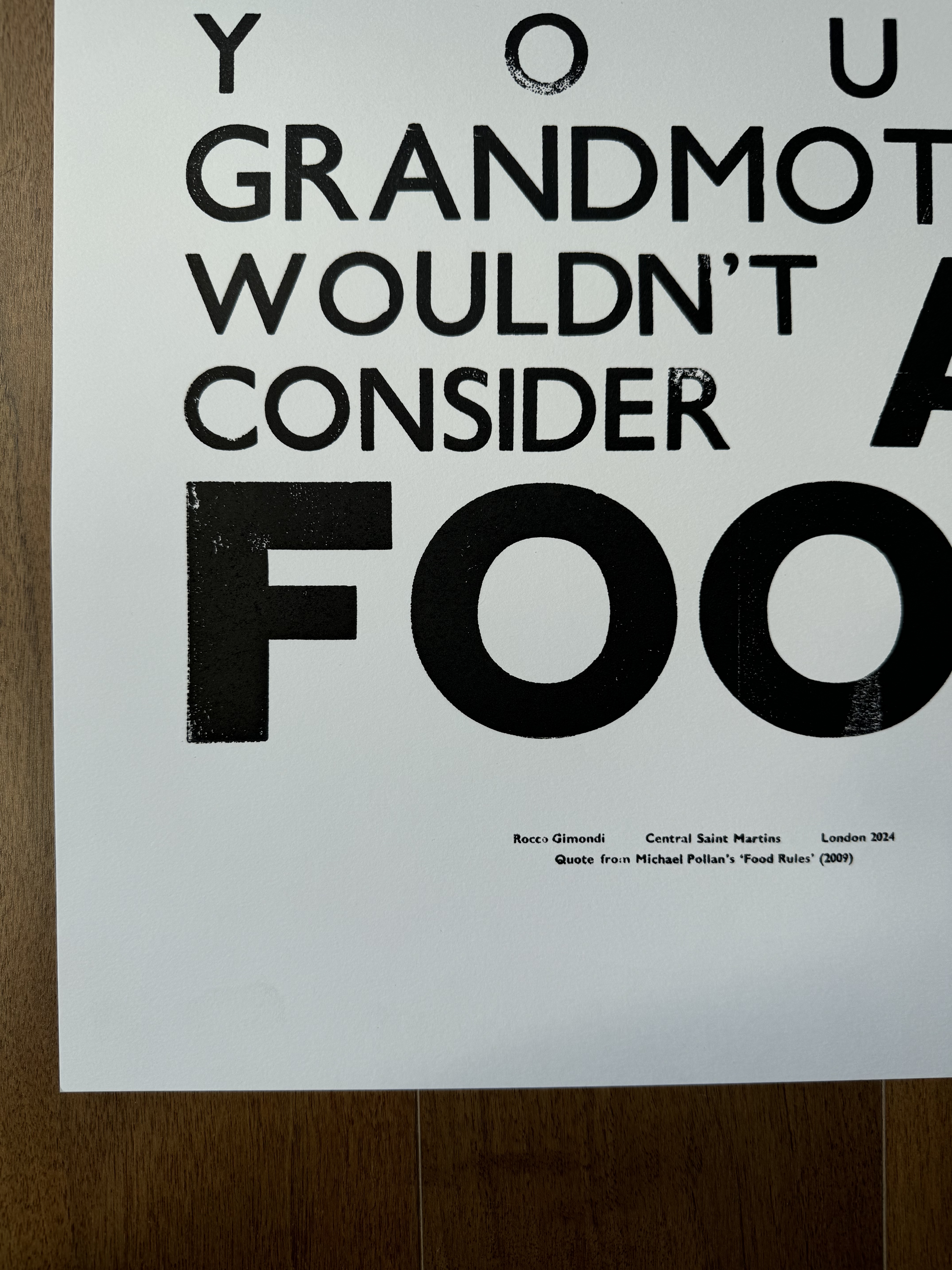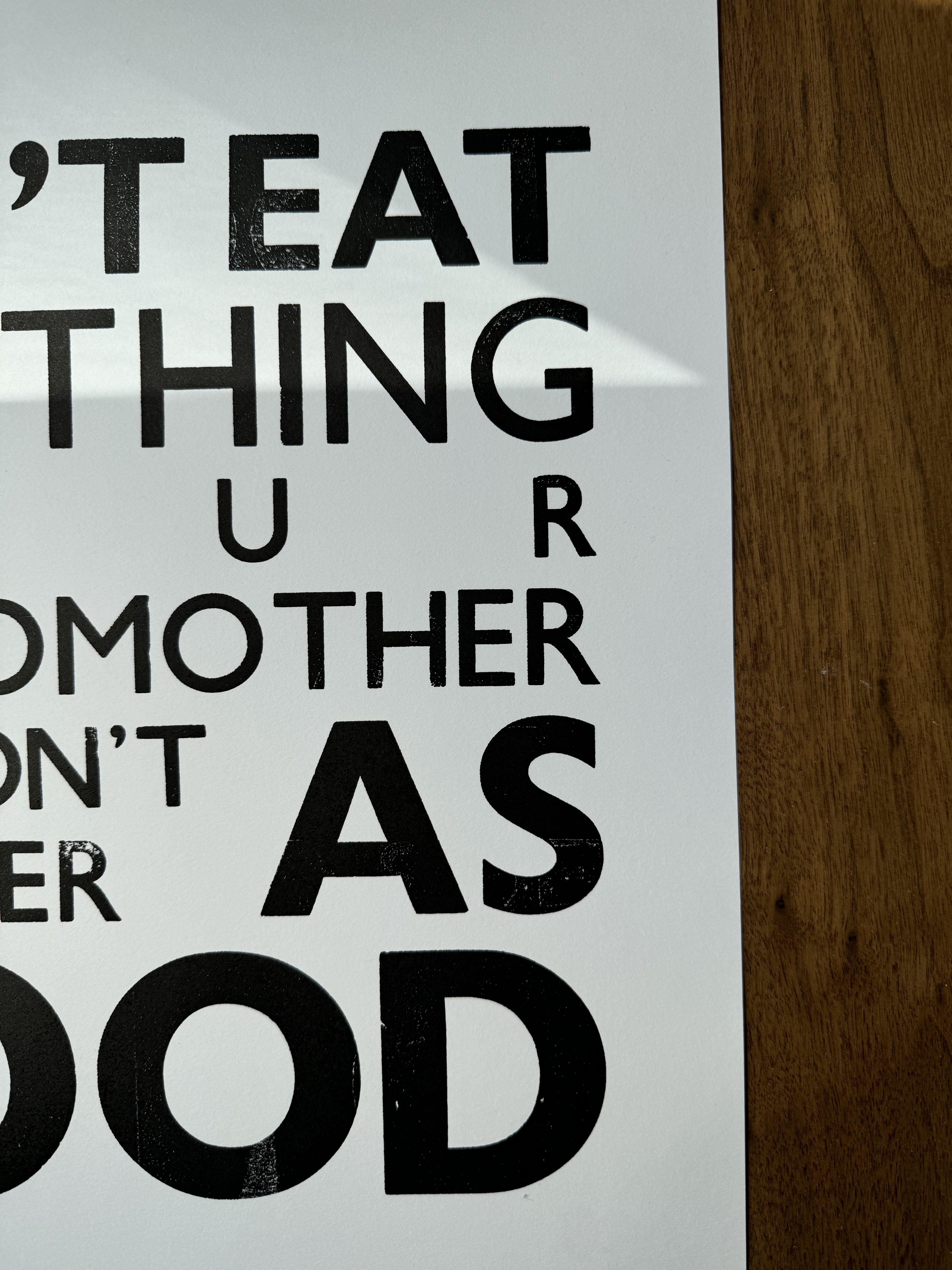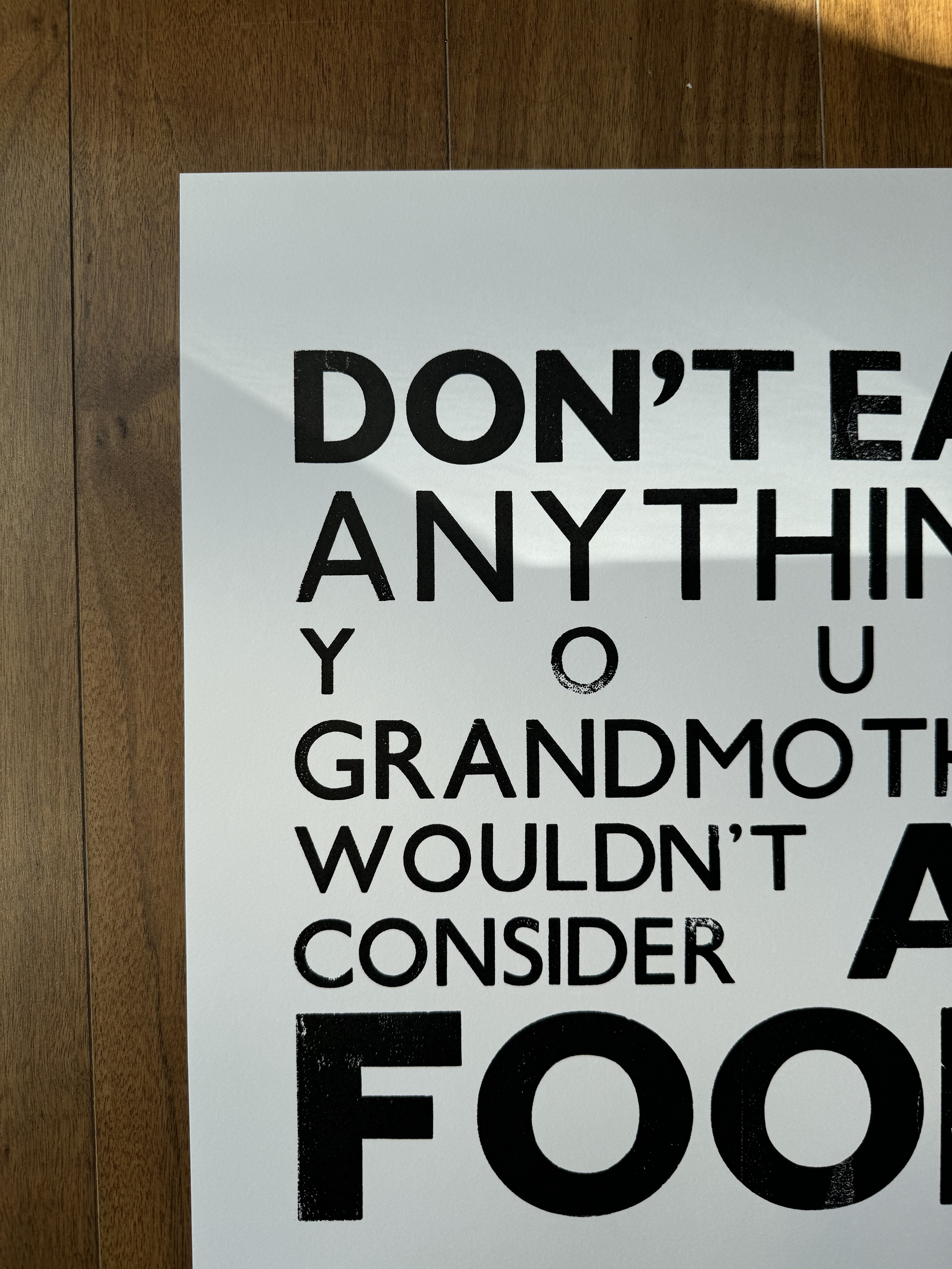 A quote from Michael Pollan's Food Rules (2009), letterpress printed using wooden Gill Sans type. Each print carries the texture and imperfections of traditional letterpress printing, making every piece slightly unique.