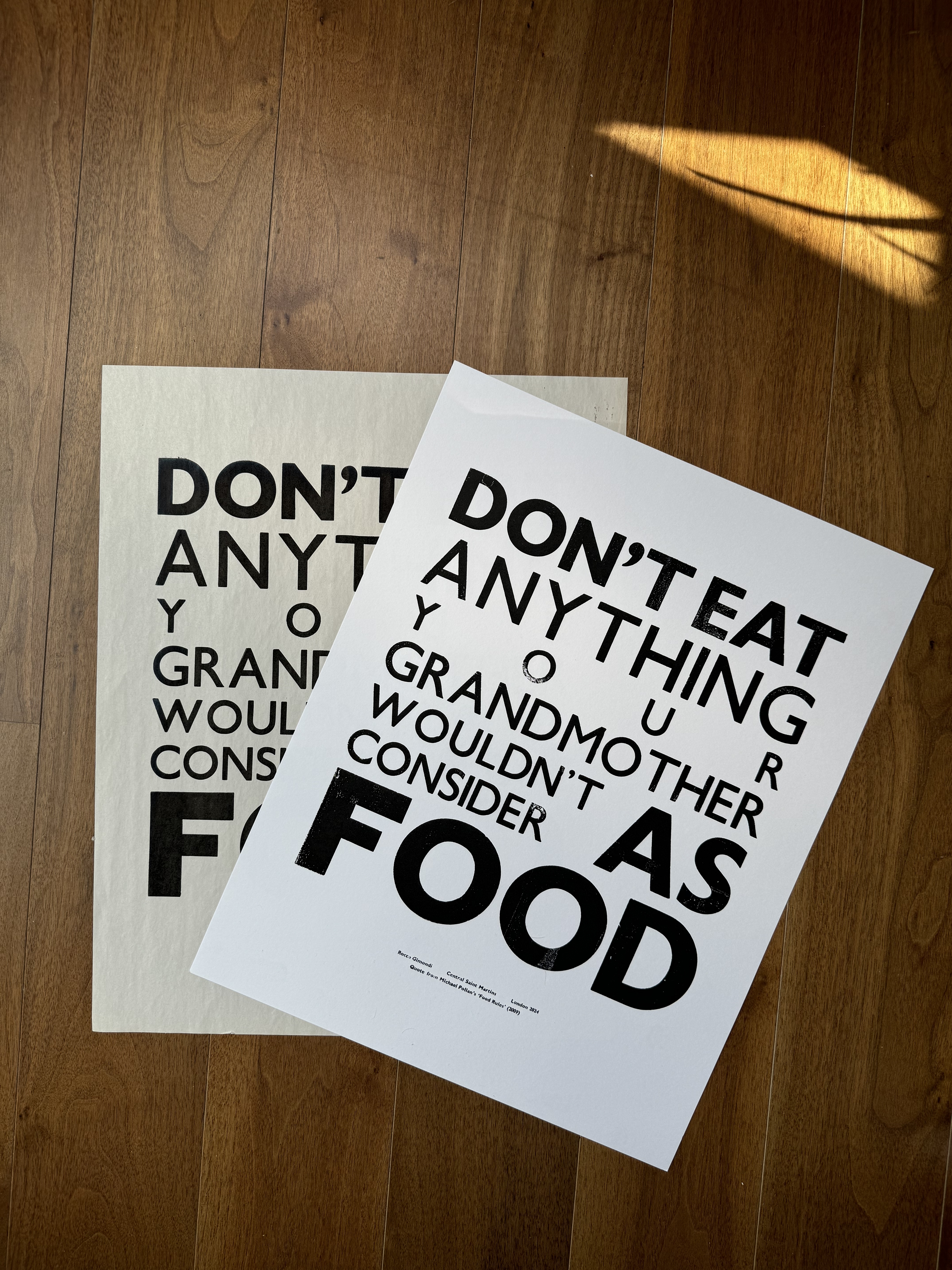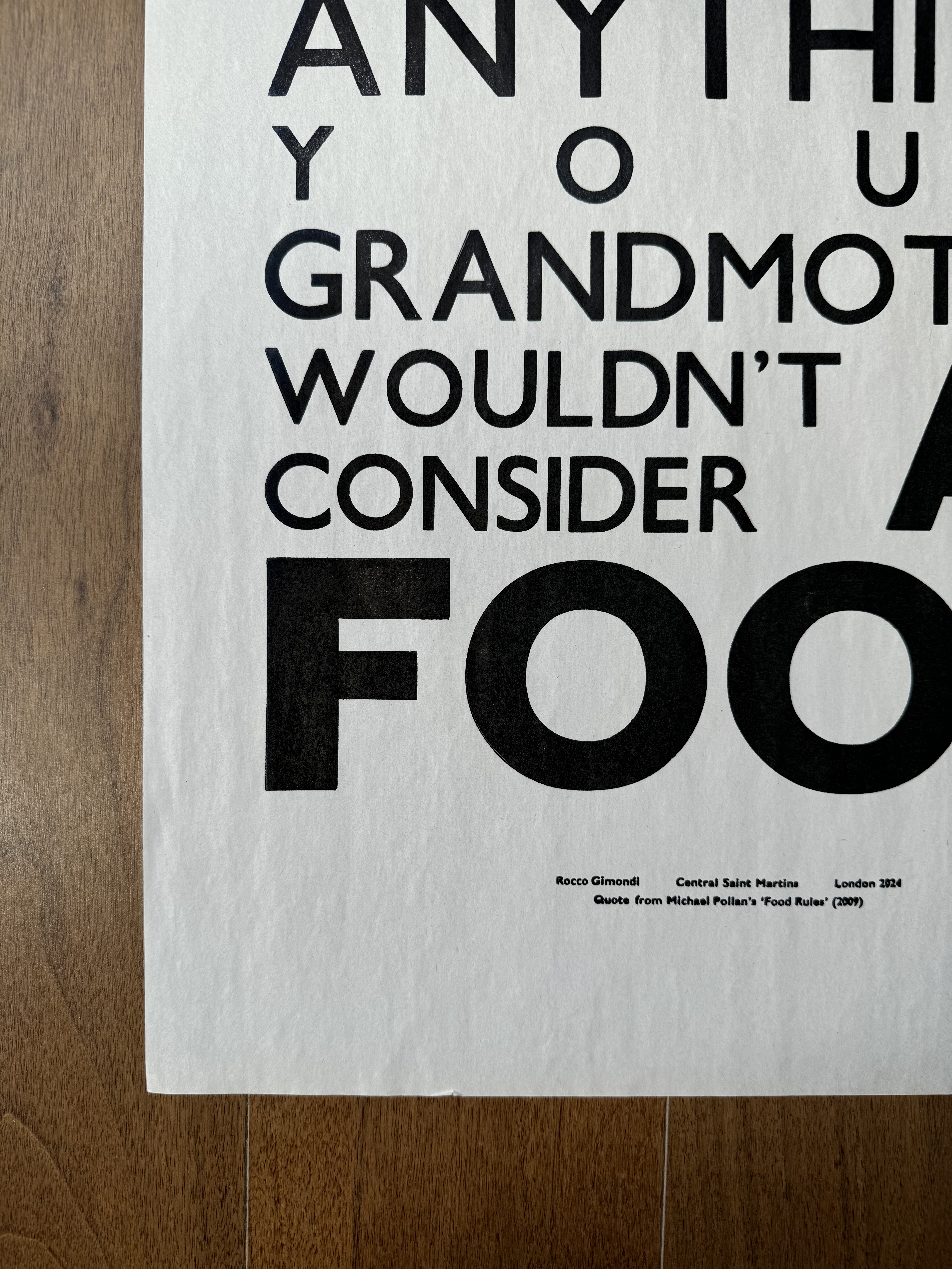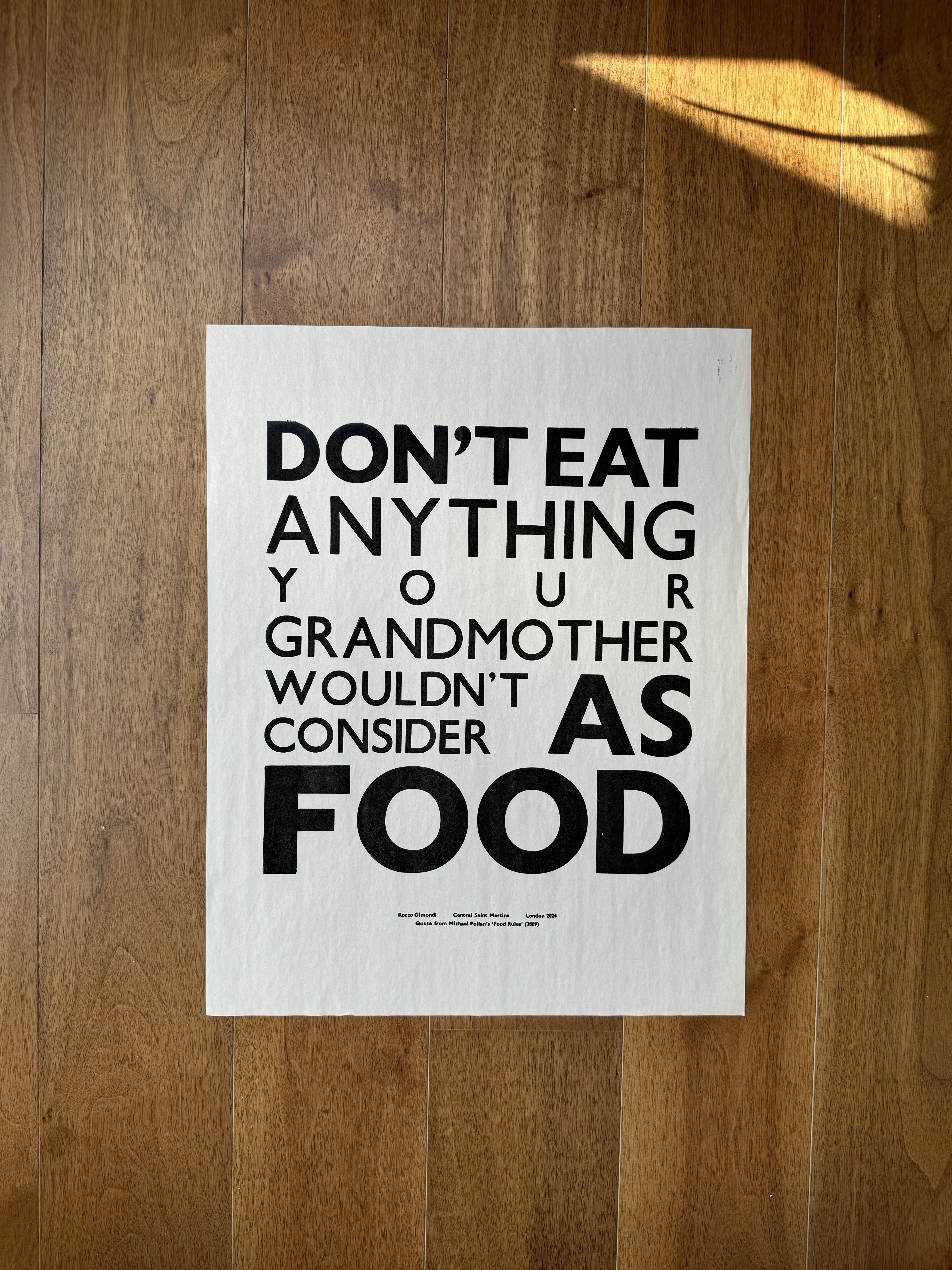 A quote from Michael Pollan's Food Rules (2009), letterpress printed using wooden Gill Sans type. Each print carries the texture and imperfections of traditional letterpress printing, making every piece slightly unique.
