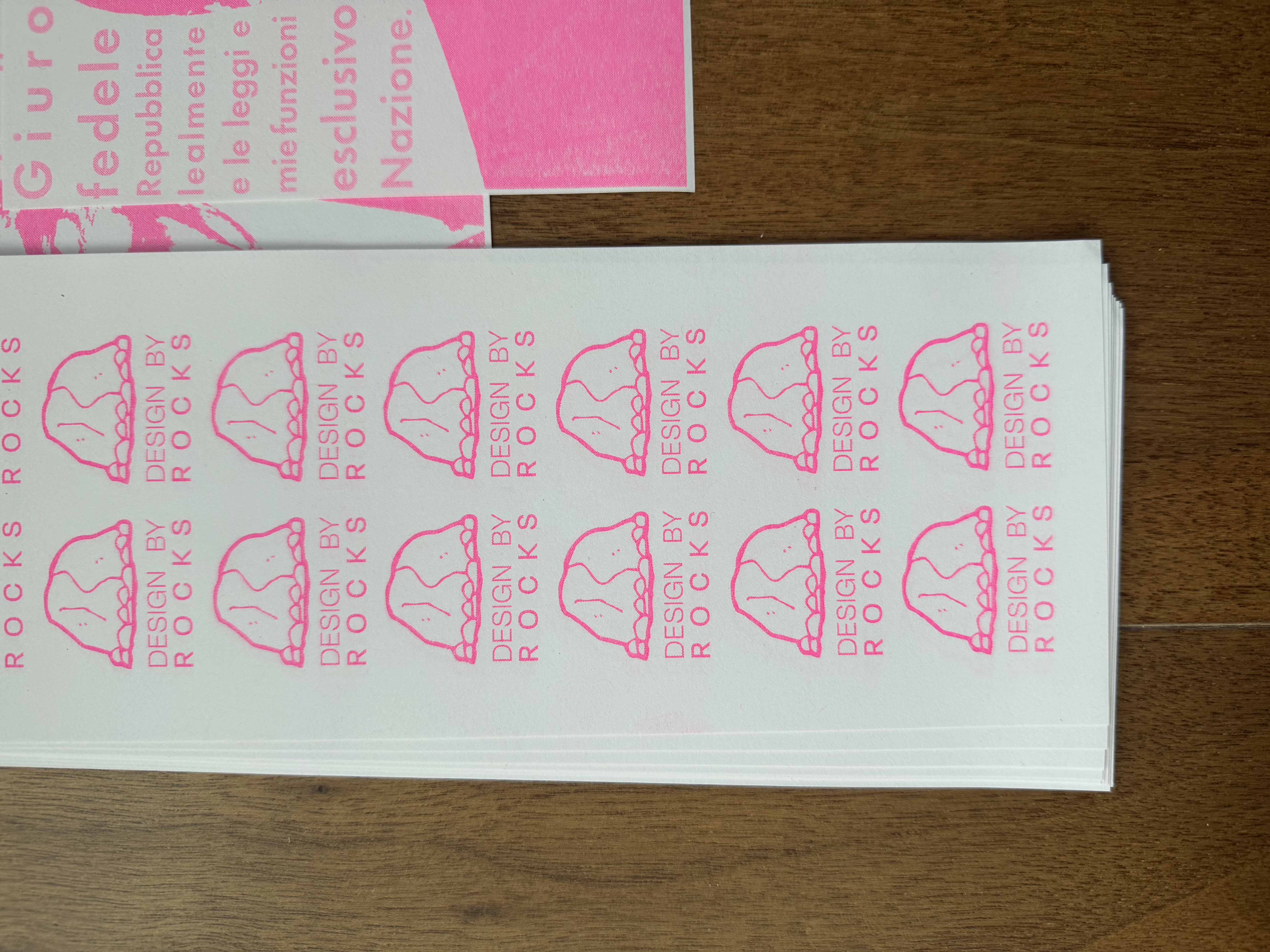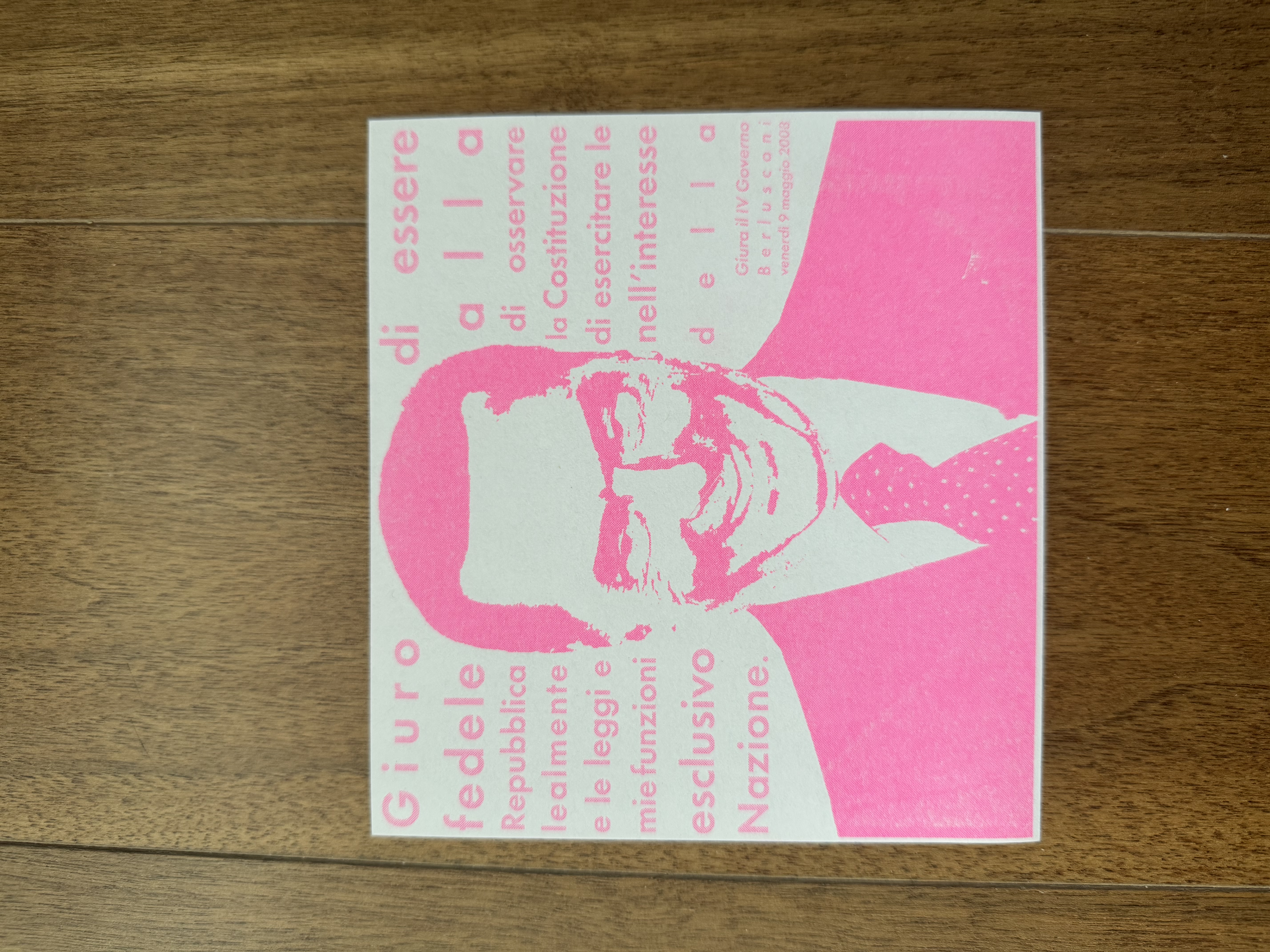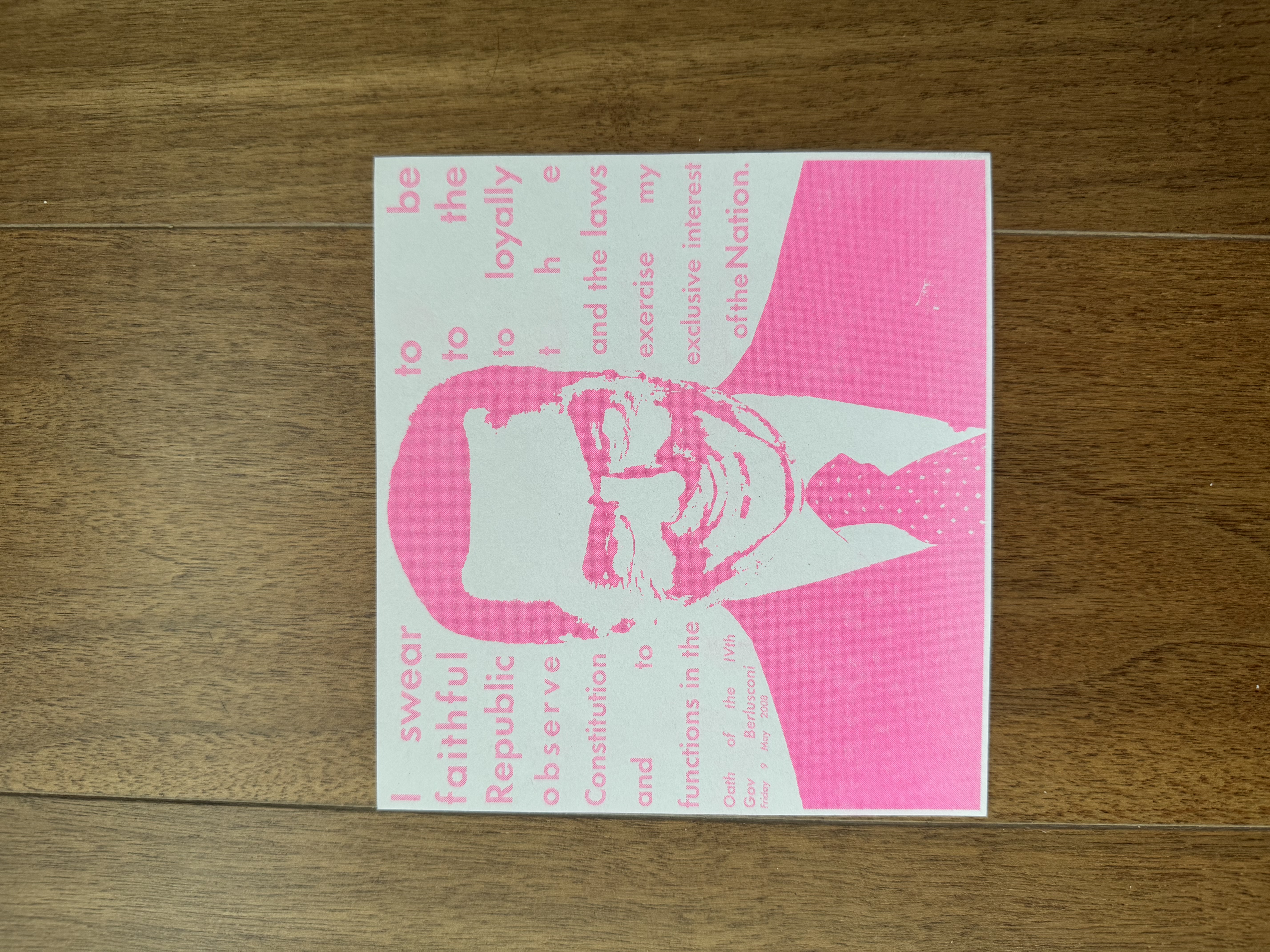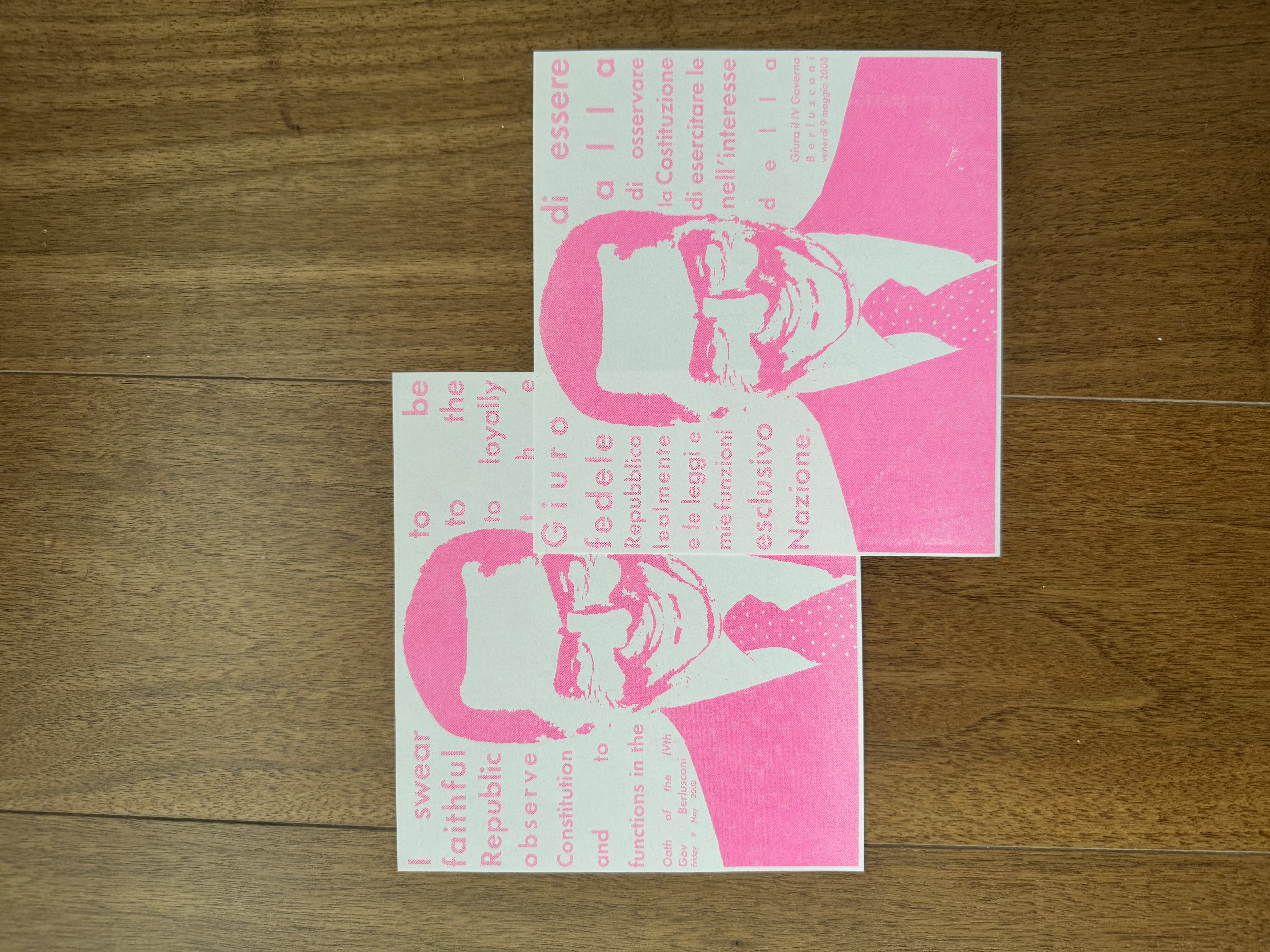 Risograph printed in pink, a nod to his well-documented passion for women and everything that entailed, Bunga Bunga parties included.